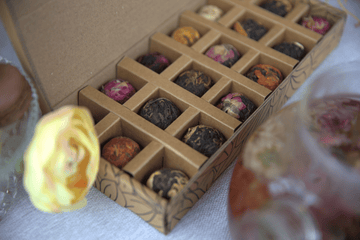 - Theepot pakket: bevat een glazen theepot en 6, 9 of 12 theebloemen